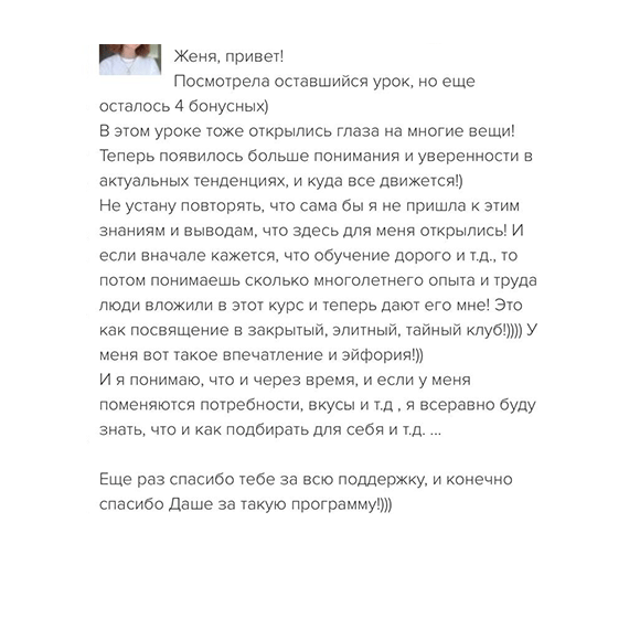 Первая — курс «Алгоритм Гардероба» Это программа о том, как составить свой уникальный базовый гардероб, опираясь на особенности своей внешности и образа жизни.
